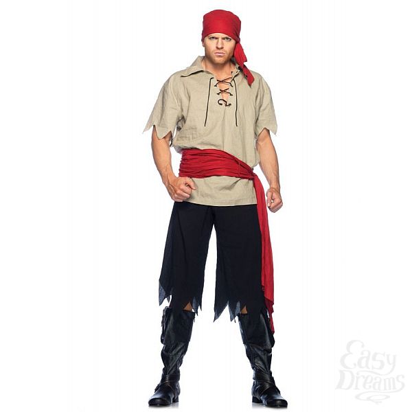 Костюм кровожадного пирата: льняная рубаха, брюки в клочьях, пояс и повязка на голову. В комплекте: рубашка, брюки, пояс, бандана.