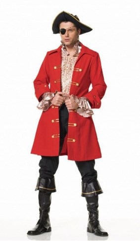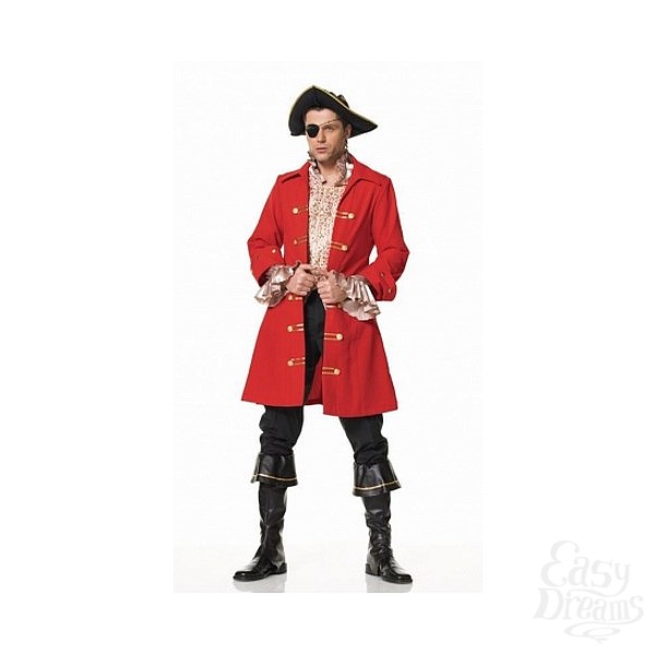 Костюм пирата выполнен в виде красного плаща и  бело-розовой рубашки с жабо. Плащ украшен золотистыми пуговицами.